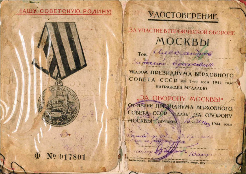Удостоверение Александрова В.Е. «За оборону Москвы».