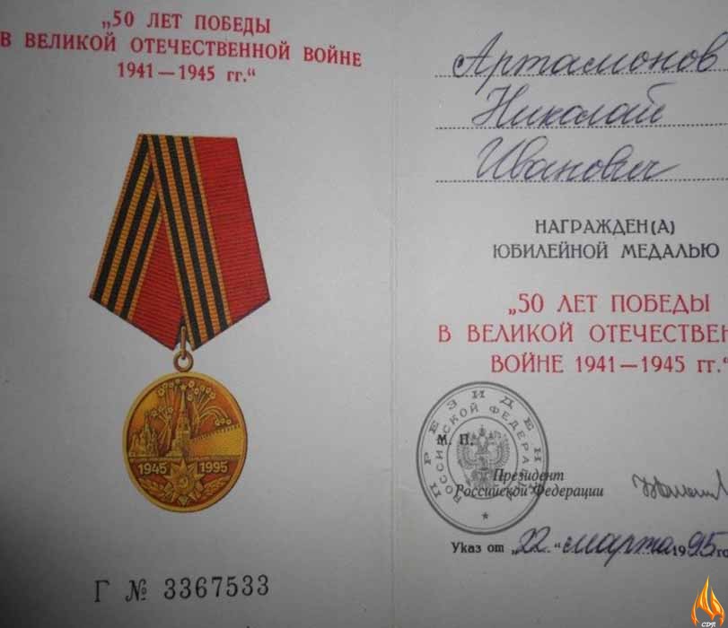 Дедушка награжден медалью «За доблестный труд в Великой Отечественной Войне 1941-1945 гг.» и юбилейной медалью «50 лет Победы в Великой Отечественной Войне 1941 -1945 гг.»