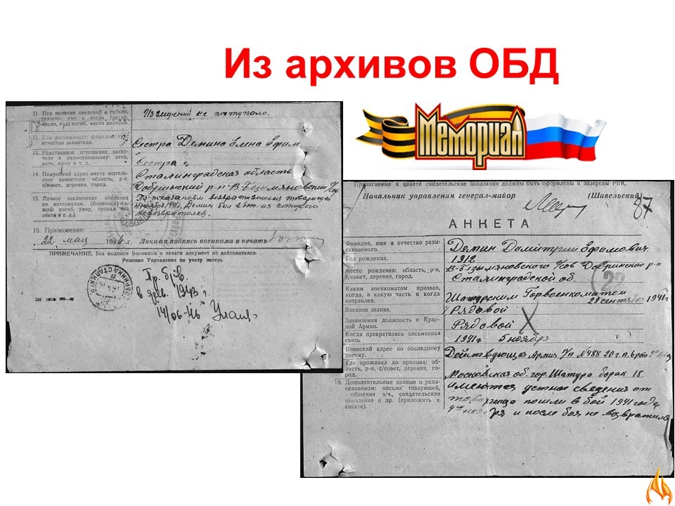 Демин Дмитрий Ефимович - 29 сентября 1941 года, взяв необходимые вещи, попрощавшись с женой и детьми, Дмитрий Ефимович ушёл на фронт. Но короток был его фронтовой путь, в октябре этого же года пришла повестка: «Рядовой боец, Дёмин Дмитрий Ефимович пропал без вести».