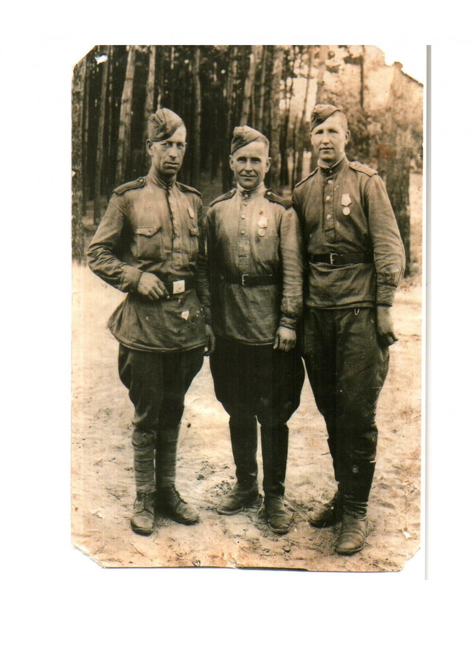 Прадед Шаповалов Алексей Тимофеевич в центре с товарищами, фото прислано с фронта, год неизвестен