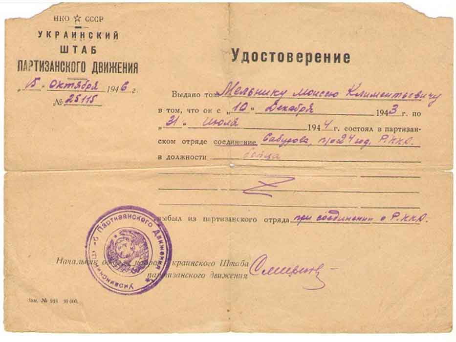 Семейные реликвии Мельника Моисея Климентьевича - С первых дней войны воевал и до 1947 года восстанавливал железнодорожные мосты в Западной Украине.