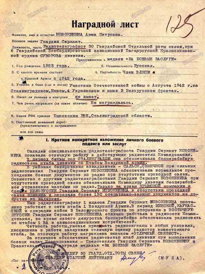 Семейные реликвии Анны Петровны Новожениной Ей было восемнадцать лет, когда началась война. Несколько раз она подавала заявление в военкомат и добилась-таки своего: в августе 1942 года ее призвали в армию. Окончив курсы телеграфистов, она попала в 8-й отдельный полк связи 8-й Воздушной Армии генерала Т.Т. Хрюкина.