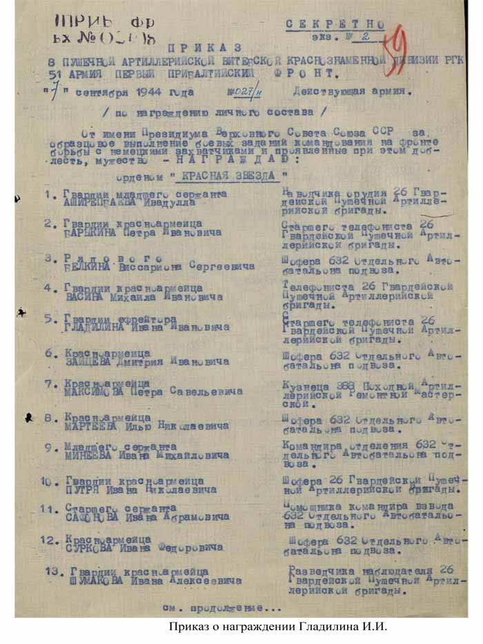 Гладилин Иван Иванович, родился 23 сентября 1920 года в с.Терса Еланского района Сталинградской области. Был призван на службу в октябре 1940 года и был демобилизован в марте 1946 года. Свой боевой путь прошел в 26 гвардейской пушечной артиллерийской бригаде в составе 51 Армии Прибалтийского фронта.
