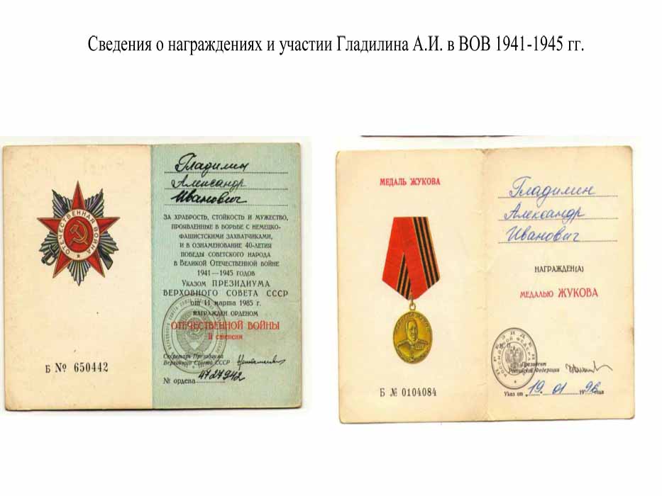 Гладилин Александр Иванович, для него служба в рядах вооруженных сил началась в сентябре 1939 года, а закончилась в 1946 году. Участвовал в боях с белофинами в 1940 году. Александра Ивановича война застала в г. Бресте.