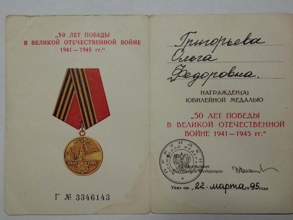 Юбилейная медаль «50 лет победы в Великой Отечественной Войне 1941-1945гг.» От имени Президента РФ медаль вручена 22 марта 1995г.