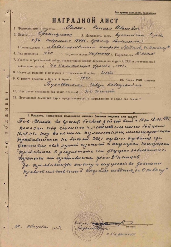 В январе 1944 года, находясь на фронте, сержант, пулеметчик воинской части № 28625 Мазко С.И. погиб, отдав свою жизнь за Родину