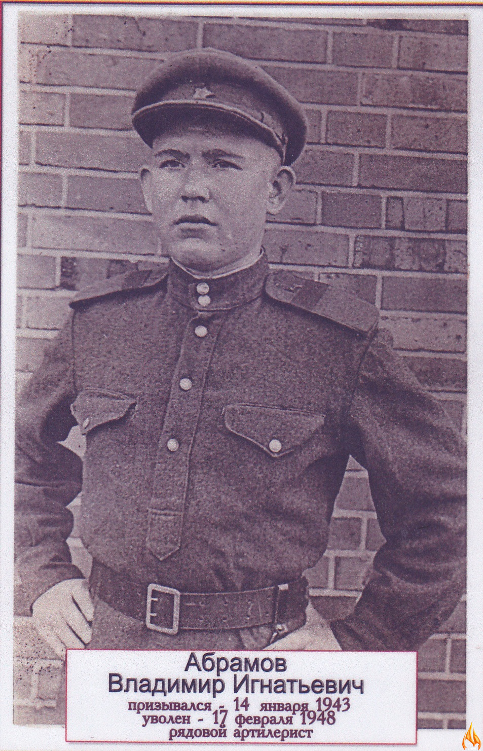 Абрамов Владимир Игнатьевич Сержант. Сразу после присяги в 1943 году вступил в бой в городе Днепропетровске. Фосировал Днепр. Участник боев за Берлин.
